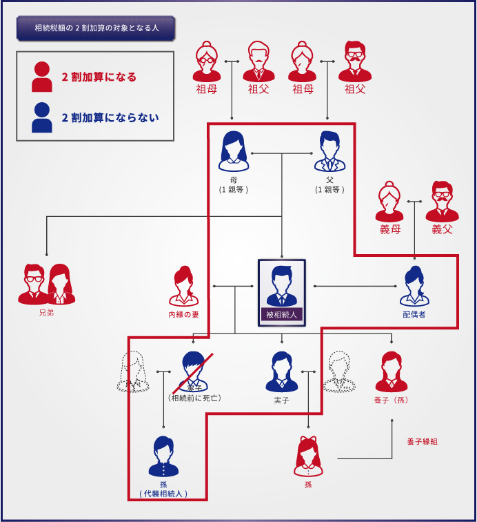 2018-01-23 相続税額の2割加算 2割加算の対象から外れる人 配偶者 1親等の血族 代襲相続人の孫 養子は2割加算の対象外 ↓孫養子は2割加算の対象(被相続人の養子となっている直系卑属は、1親等の血族に含まない←相続税の1代飛ばしを抑制) ↓孫養子が代襲相続するときは、2割加算の対象外